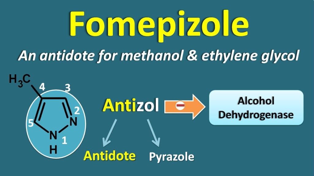 Η φομεπιζόλη (fomepizole) χρησιμοποιείται ως αντίδοτο στην επιβεβαιωμένη ή ύποπτη δηλητηρίαση από μεθανόλη ή γλυκόλη αιθυλενίου. Η φομεπιζόλη είναι ένας ανταγωνιστικός αναστολέας της αφυδρογονάσης της αλκοόλης, του ενζύμου που καταλύει τα πρώτα βήματα στο μεταβολισμό της αιθυλενογλυκόλης και μεθανόλης στους τοξικούς μεταβολίτες τους.