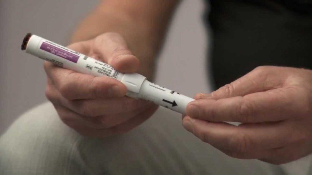 3. Χτυπήστε με δύναμη την ένεση στη έξω επιφάνεια του μηρού μέχρι να ακουστεί ο χαρακτηριστικός ήχος “κλικ” που δηλώνει ενεργοποίηση του αυτόματου μηχανισμού χορήγησης. Κρατήστε την ένεση στη θέση αυτή 10 sec μέχρι να απελευθερωθεί όλη η ποσότητα του φαρμάκου (Μετρήστε μέχρι το 10). Απομακρύνεται την ένεση και πάρτε την άδεια συσκευή μαζί σας στο Τμήμα A’ Βοηθειών. Μαλάξετε την περιοχή χορήγησης του φαρμάκου για 10 sec (Ενδεχομένως η ένεση να προκαλέσει για λίγο διάστημα ταχυκαρδία, ρίγος ή ήπιο τρόμο, μην ανησυχήσετε…).