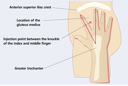 Σχηματίζεται ένας σταυρός σε κάθε γλουτό και η ένεση γίνεται στο άνω και έξω τεταρτημόριο.
