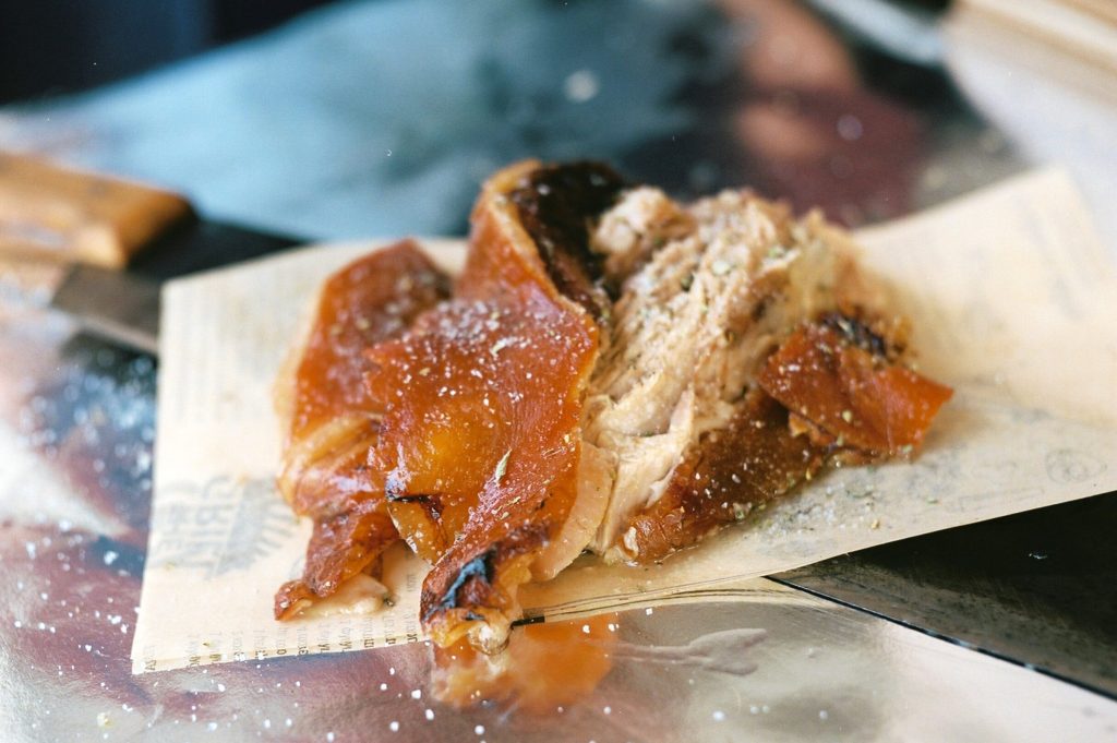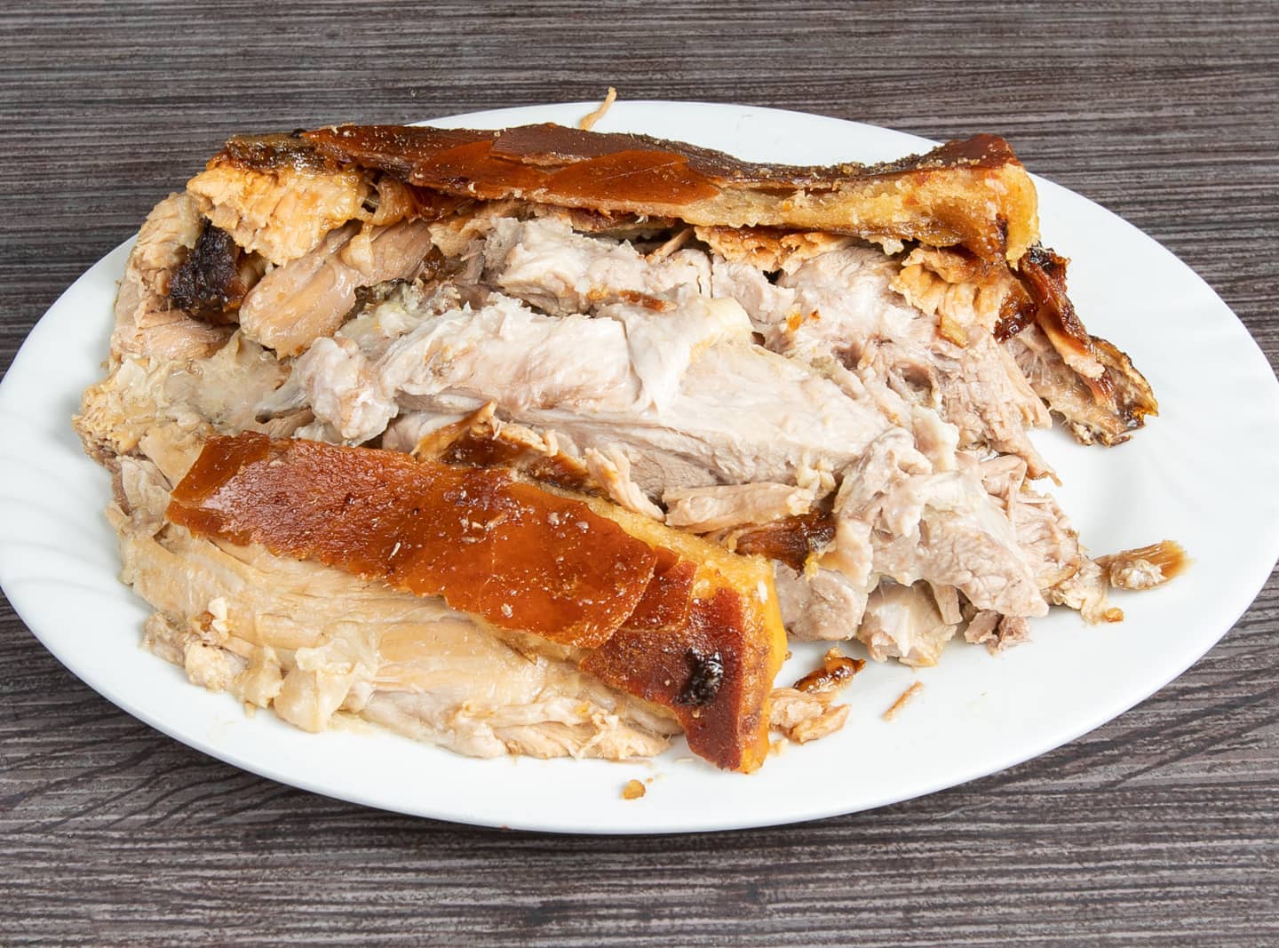 4. Ψήνετε σε προθερμασμένο φούρνο στους 140 βαθμούς για 4-5 ώρες. Ανά τακτά διαστήματα, με ένα κουτάλι παίρνετε ζωμό από το ταψί και λούζετε το κρέας για να γίνει τραγανιστή η πέτσα του.
