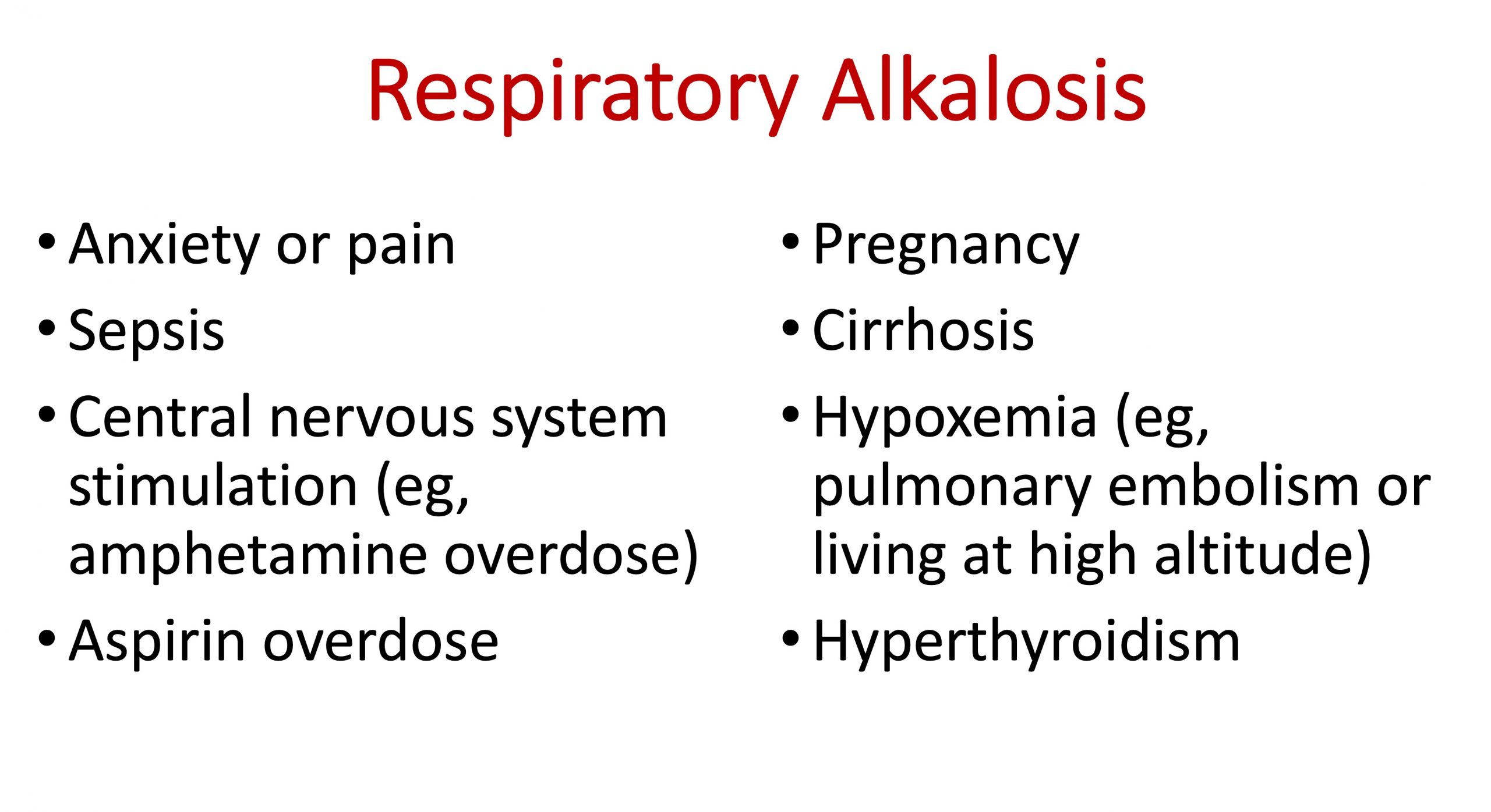 Αναπνευστική αλκάλωση συμβαίνει, συνήθως, όταν κάποιο ερέθισμα προκαλεί αυξημένη αναπνοή και παράγει την αποβολή του CO2 από την κυκλοφορία. Αυτό αλλάζει τη δυναμική χημικής ισορροπίας του διοξειδίου του άνθρακα στο κυκλοφορικό σύστημα και το σύστημα αντιδρά σύμφωνα με την αρχή του Le Chatelier. Το καθαρό αποτέλεσμα αυτού είναι η μειωμένη συγκέντρωση ιόντων υδρογόνου και έτσι αυξημένο pΗ (αλκάλωση). Υπάρχει, επίσης, μια μείωση στην συγκέντρωση του ιονισμένου ασβεστίου στο αίμα.