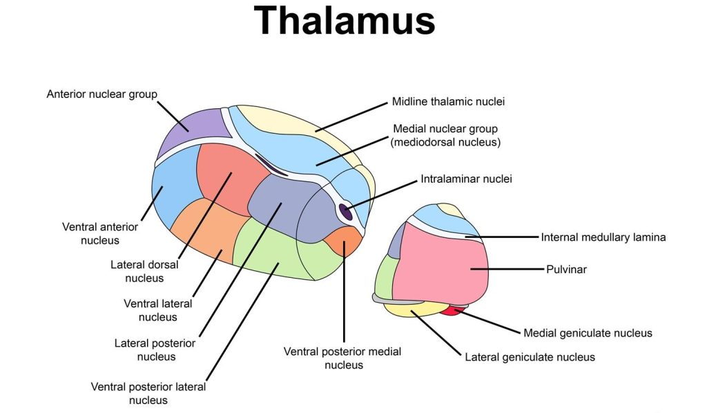 Πιο πίσω (ουριαία) από τον πρόσθιο κοιλιακό πυρήνα βρίσκεται ο έξω κοιλιακός πυρήνας, ο οποίος συνδέεται με το πρώτο, καθώς και με την ωχρά σφαίρα, τη μέλαινα ουσία και την παρεγκεφαλίδα. Χωρίζεται σε τρία μέρη (έσω, πρόσθιο και οπίσθιο) και σχετίζεται με τη μυϊκή λειτουργία. Πιο ουριαία του έξω κοιλιακού βρίσκεται ο οπίσθιος κοιλιακός πυρήνας, ο οποίος υποδιαιρείται σε δύο μικρότερους πυρήνες, στον οπίσθιο έσω και οπίσθιο έξω κοιλιακό πυρήνα. Σχετίζεται με τις αισθητικές οδούς. Ο οπίσθιος έξω λαμβάνει αισθητικές πληροφορίες από τα άκρα και το τράχηλος, ενώ o έσω από το κεφάλι. Η γεύση και οι αιθουσαίες πληροφορίες μεταφέρονται στο οπίσθιο έσω πυρήνα. Ο οπίσθιος κοιλιακός πυρήνας προβάλλει στο βρεγματικό λοβό.