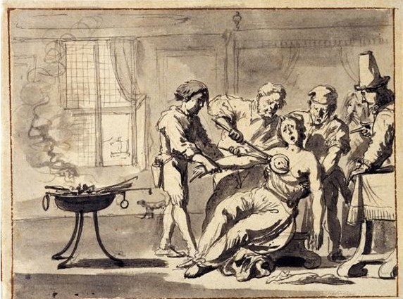 Το Ζωηρό παράδειγμα του ζωγράφου Romeyn de Hooghe, που δείχνει, πως γινόταν μια μαστεκτομή στο σπίτι, αναμφισβήτητα αντλήθηκε από την πραγματικότητα. Το δράμα λάμβανε χώρα παρουσία του συζύγου και των δύο θυγατέρων, που θρηνούσαν στην κρεβατοκάμαρα της ασθενούς, γιατί μέχρι το τέλος του 19ου αιώνα τα νοσοκομεία ήταν μόνο για άπορους. Η ασθενής καθόταν σε μια καρέκλα απέναντι από τον χειρουργό, που θα έκοβε το νοσούν όργανο. Ήταν ακινητοποιημένη από έναν βοηθό, ενώ ένας δεύτερος βοηθός σκουπίζει το αίμα, που αναβλύζει από το τραύμα. Ο βραχίονας ομόπλευρα της βλάβης απάγεται και ανυψώνεται για να σφίξει ο θωρακικός μυς, όπως προτείνεται στα βιβλία αναφοράς εκείνης της περιόδου. Σε ένα τραπέζι κάθεται ο παθολόγος, που χωρίς την παρουσία του, δεν επιτρεπόταν να εκτελέσει ο χειρουργός μια μεγάλη επέμβαση. Αξιοπρεπής και ακίνητος κρατά την πένα του, πιθανώς για να συνταγογραφήσει τα κατάλληλα φάρμακα και τη δίαιτα.