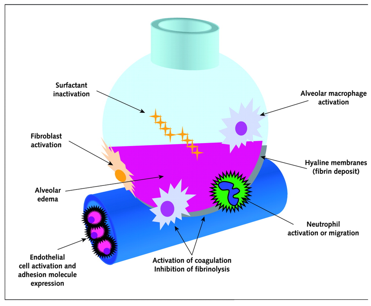 Η υποξαιμία είναι σοβαρή και χαρακτηριστικά πολύ αvθεκτική και δεν ανατάσσεται ακόμη και με χορήγηση οξυγόνου με μάσκα ή καθετήρα. Αξιοσημείωτη είναι η μείωση της ενδοτικότητας (compliance) των πνευμόνων και η αύξηση του όγκου του νεκρού χώρου. Ακτινολογικώς παρατηρείται διάχυτη διήθηση των πνευμόνων (διάχυτη θολερότητα).