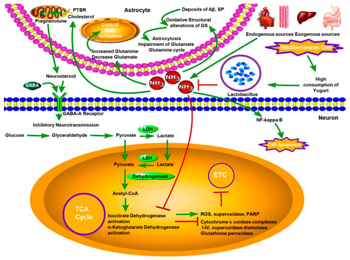 Η αμμωνία (ΝΗ3) είναι ένα παραπροϊόν που σχηματίζεται ως αποτέλεσμα της διάσπασης του αζώτου κατά τη διάρκεια του μεταβολισμού των πρωτεϊνών στο έντερο και από την πέψη του αίματος που μπορεί να βρίσκεται στον γαστρεντερικό σωλήνα, όπως σε κιρσούς οισοφάγου. Μια άλλη σημαντική πηγή αμμωνίας είναι από τη σύνθεση και τη μετατροπή της γλουταμίνης από τα νεφρικά σωληνάρια.