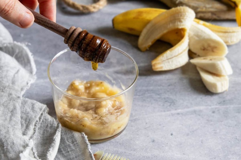 - Ανακατέψτε καλά τις μπανάνες, με το μέλι.