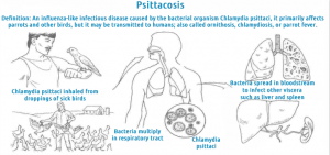 Έκθεση σε μολυσμένο πτηνό, συνήθως, περιστέρι ή παπαγάλος ή πτηνό της οικογένειας των Ψιττακιδών (Psittacidae) ή επαγγελματική έκθεση σε εκτροφεία γαλοπούλας ή πάπιας. Τα μολυσμένα πτηνά μπορεί να φαίνονται υγιή.