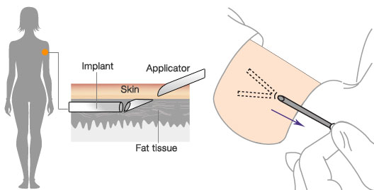 Το εμφύτευμα ελέγχου των γεννήσεων είναι μία ράβδος που τοποθετείται κάτω από το δέρμα του άνω βραχίονα. Απελευθερώνει την ίδια ορμόνη, αλλά το εμφύτευμα προστατεύει από ανεπιθύμητη κύηση για 3 χρόνια. Το ποσοστό αποτυχίας είναι μικρότερο από 1%. Μπορεί να προκαλέσει παρενέργειες και ακανόνιστη αιμορραγία. Δεν προστατεύει από τα ΣΜΝ.