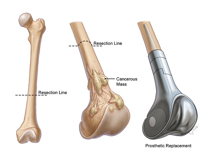 • Χειρουργική διάσωση του άκρου που αφαιρεί το τμήμα του οστού με τον καρκίνο. Οι κοντινοί μύες, τένοντες και άλλοι ιστοί δεν αφαιρούνται. Ένα μεταλλικό εμφύτευμα (πρόθεση άκρου ή τεχνητό μέλος) αντικαθιστά το τμήμα του οστού που απομακρύνεται.