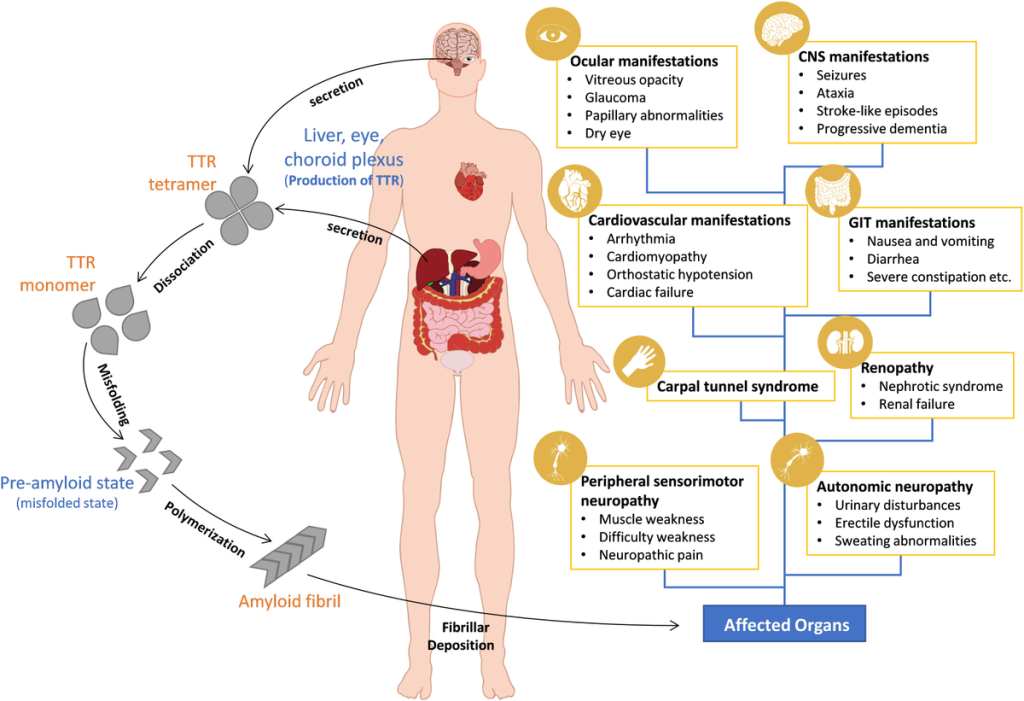 Η συγκέντρωση της πρόδρομης πρωτεΐνης οδηγεί σε περιφερική νευροπάθεια ή/και δυσλειτουργία του αυτόνομου νευρικού συστήματος. Αυτές οι πρωτεΐνες είναι: η τρανσθυρετίνη, η απολιποπρωτεΐνη Α1 και η γελσολίνη.
