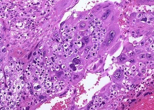 - Τα ιστολογικά ευρήματα: Μικρό οζίδιο αιμορραγικό με γκριζωπό-λευκό όγκο στην περιφέρεια. Η ιστολογική εξέταση δείχνει ότι το χοριοκαρκίνωμα περιέχει τόσο συγκυτιοτροφοβλαστικά όσο και τροφοβλαστικά κύτταρα. Τα συγκυτιοτροφοβλαστικά κύτταρα είναι υπεύθυνα για την παραγωγή της β χοριακής γοναδοτροπίνης.