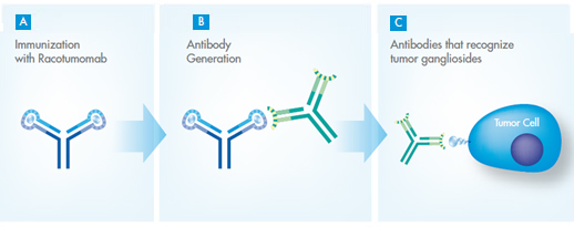Το Racotumomab είναι ένα αντι-ιδιοτυπικό μονοκλωνικό αντίσωμα που επάγει στους ασθενείς μια ισχυρή ανοσοαπόκριση έναντι ειδικών γλυκοσυλιωμένων γαγγλιοσιδών (NeuGcGM3) που υπάρχουν στα κύτταρα του όγκου.