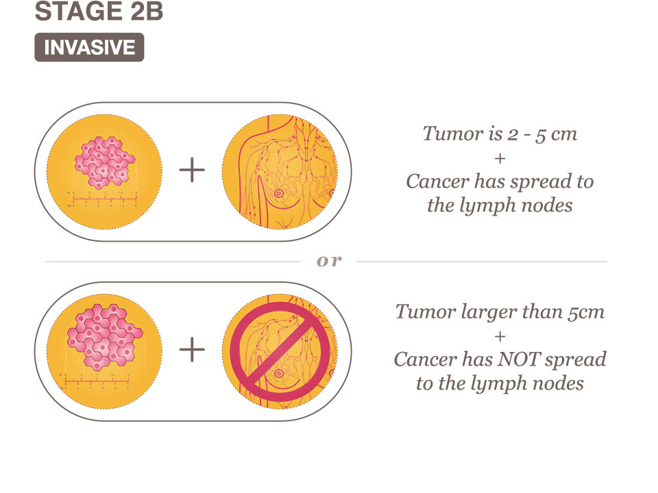 Αυτό το στάδιο χωρίζεται σε Στάδιο 2Α και 2Β. Η διαφορά καθορίζεται από το μέγεθος του όγκου και αν ο καρκίνος του μαστού έχει εξαπλωθεί στους λεμφαδένες.