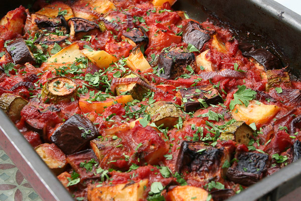 - Τα βάζετε όλα τα λαχανικά σε ένα ταψί και από πάνω ρίχνετε το μείγμα ντομάτας και το λάδι.