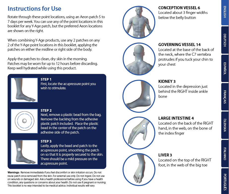 Το επίθεμα Y-Age Aeon μειώνει τα επίπεδα στρες και βοηθάει στην καταπολέμηση  της γήρανσης του πληθυσμού. Το επίθεμα Y-Age Aeon εφαρμόζεται σε σημεία βελονισμού που έχουν γνωστό ότι διεγείρουν το ανοσοποιητικό σύστημα