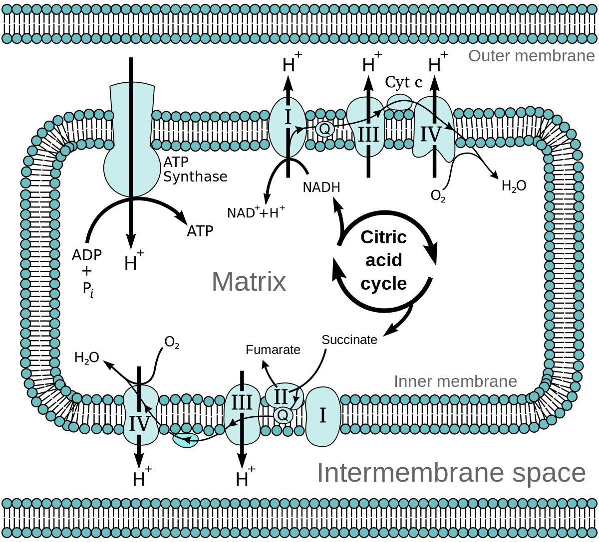 Η ενέργεια οξειδοαναγωγής από NADH και FADH2 μεταφέρεται σε οξυγόνο (Ο2) σε πολλά στάδια μέσω της αλυσίδας μεταφοράς ηλεκτρονίων. Αυτά τα πλούσια σε ενέργεια μόρια παράγονται εντός της μήτρας μέσω του κύκλου του κιτρικού οξέος, αλλά παράγονται, επίσης, στο κυτταρόπλασμα με γλυκόλυση.