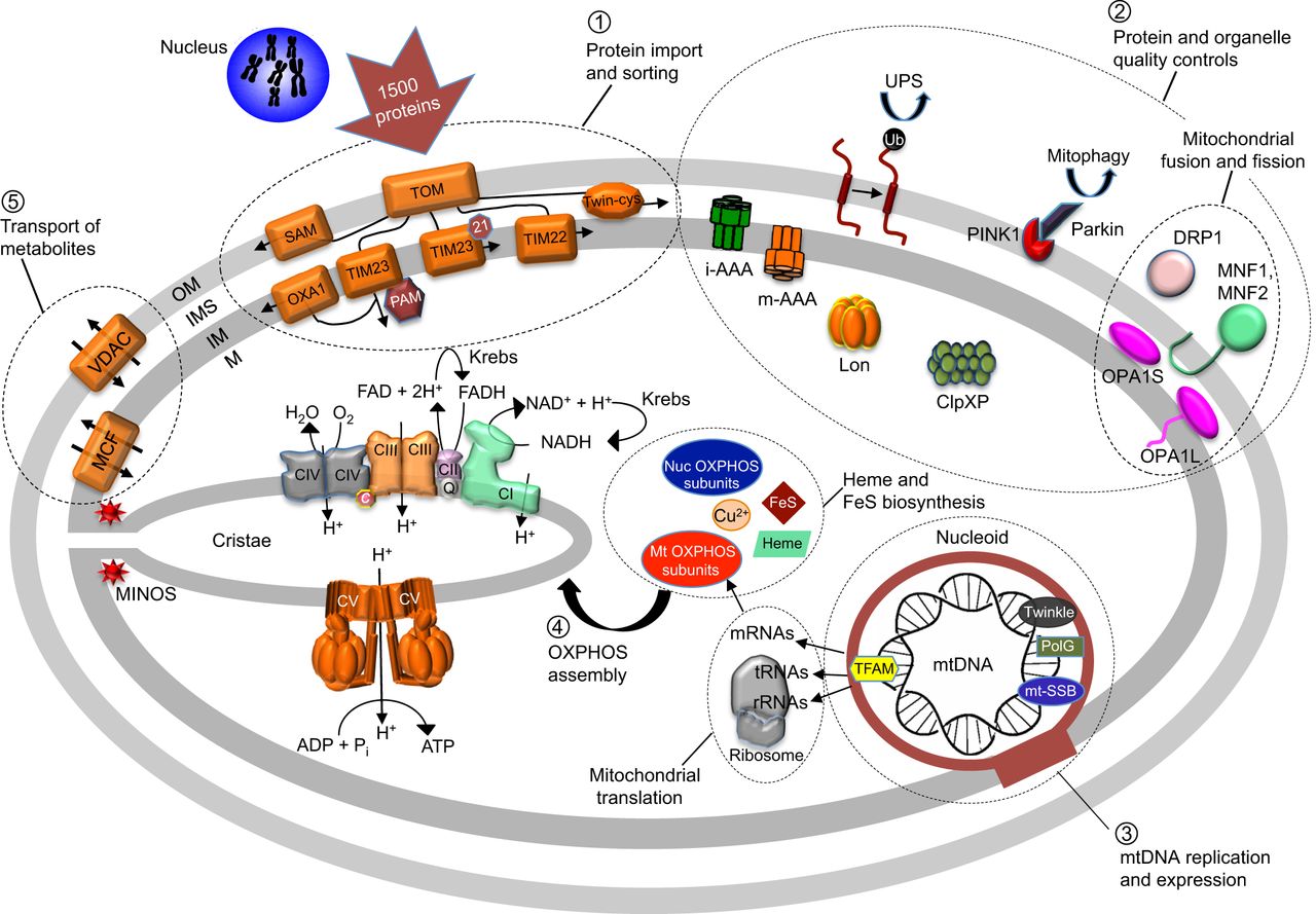 Τα μιτοχόνδρια είναι ημιαυτόνομα οργανίδια και διαθέτουν δικό τους DNA, έτσι ώστε να μπορούν να αναπαράγονται, χωρίς να χρειάζεται να διαιρεθεί το κύτταρο. Το DNA των μιτοχονδρίων είναι δίκλωνο κυκλικό και είναι τοποθετημένο στις εσοχές που δημιουργεί η εσωτερική μεμβράνη. Κάθε μιτοχόνδριο περιέχει 2 έως δέκα αντίγραφα του κυκλικού αυτού μορίου DNA. Επίσης, υπάρχει ένα ολοκληρωμένο σύστημα έκφρασης των γονιδίων που περιλαμβάνει ριβοσωμάτα και άλλες πρωτεΐνες που είναι απαραίτητες γι’ αυτήν την λειτουργία. Η είσοδος των πρωτεινών στο μιτοχόνδριο πραγματοποιείται με τη βοήθεια ενός ειδικού σήματος και της κυτοσολικής συνοδού HSC70, η οποία αποτρέπει το πρώιμο δίπλωμα της πρωτεϊνης. Στη συνέχεια προσδένεται σε ενα πρωτεινικό σύμπλοκο της εξωτερικής μεμβράνης του μιτοχονδρίου και έπειτα στο εσωτερικό σύμπλοκο. Μόλις φτάσει στη μήτρα του μιτοχονδρίου, μια πεπτιδάση αφαιρεί το ειδικό σήμα διαλογής. Εάν όμως η πρωτεϊνη έχει στόχο να ανγκυροβολήσει στις βιομεμβράνες του οργανιδίου, θα εμφανιστεί μετά την αποκοπή του σήματος διαλογής, ένα άλλο ειδικό σήμα θέσης.