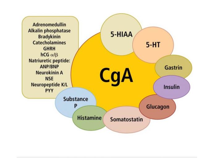 Η CgA εκφράζεται αποκλειστικά στα νευροενδοκρινή κύτταρα και χαρακτηρίζεται από παράλληλη έκφραση ορμονών ή νευροδιαβιβαστών. Η μέτρηση της CgA βοηθά στην εκτίμηση της πολλαπλής ενδοκρινής νεοπλασίας τύπου Ι (MEN – 1). Αποτελεί αξιόπιστο δείκτη για τον μικροκυτταρικό καρκίνωμα πνεύμονα, τους νευροενδοκρινείς όγκους του γαστρεντεροπαγκρεατικού συστήματος, το φαιοχρωμοκύττωμα, το νευροβλάστωμα, το μυελοειδές καρκίνωμα του θυρεοειδούς και το αδενοκαρκίνωμα προστάτη με εστιακή νευροενδοκρινή διαφοροποίηση.