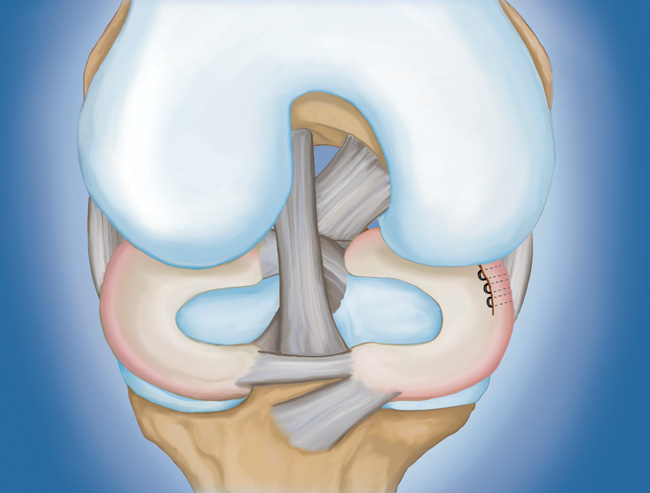 Εάν ο τραυματισμός του μηνίσκου απομονωθεί, τότε το γόνατο θα είναι σχετικά σταθερό. Ωστόσο, αν ένας άλλος τραυματισμός όπως ένας τραυματισμός πρόσθιου σταυροειδούς συνδέσμου γίνει σε ένα σχισμένο μηνίσκο, τότε θα πραγματοποιηθεί αρθροσκόπηση. Μια επισκευή με μηνίσκους έχει υψηλότερο ποσοστό επιτυχίας εάν υπάρχει επαρκής παροχή αίματος στο περιφερειακό χείλος. Το εσωτερικό του μηνίσκου είναι μη αγγειακό, αλλά η παροχή αίματος μπορεί να διεισδύσει μέχρι περίπου 6 χιλιοστά. Ως εκ τούτου, τα δάκρυα που συμβαίνουν κοντά στο περιφερικό χείλος μπορούν να επουλωθούν μετά από μια επισκευή του μηνίσκου. Μια μελέτη  διαπίστωσε ότι είναι καλύτερο να αποκατασταθεί ο μηνίσκος παρά να απομακρυνθεί με εκτομή μηνίσκου. Το ποσό του χρόνου αποκατάστασης που απαιτείται για μια επισκευή είναι μεγαλύτερο από τη συντηρητική θεραπεία, αλλά η αφαίρεση του μηνίσκου μπορεί να προκαλέσει προβλήματα οστεοαρθρίτιδας. Εάν απομακρυνθεί ο μηνίσκος, ο ασθενής θα βρίσκεται σε κατάκλιση για περίπου τέσσερις έως έξι εβδομάδες. Εάν πραγματοποιηθεί μια επισκευή, τότε ο ασθενής θα χρειαστεί τέσσερις έως έξι μήνες.