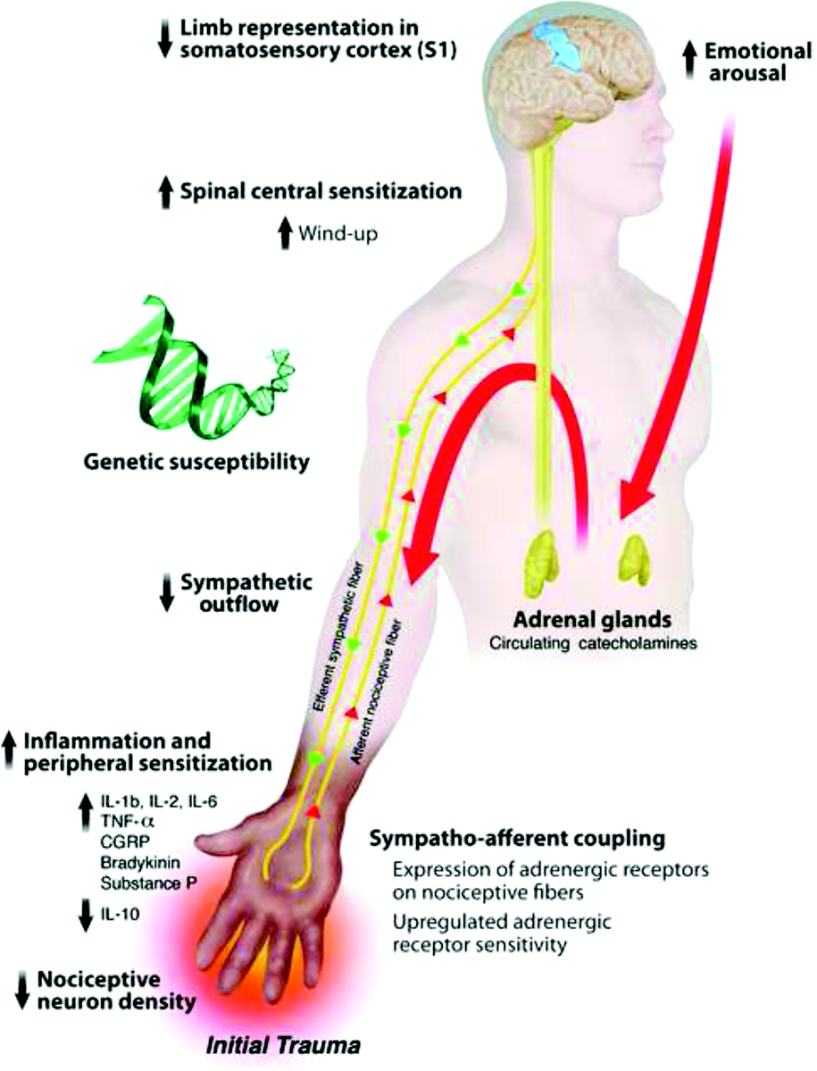 Τα κλινικά χαρακτηριστικά του CRPS έχουν βρεθεί ότι είναι φλεγμονή που προκύπτει από την απελευθέρωση ορισμένων προφλεγμονωδών χημικών σημάτων από τα νεύρα, οι ευαισθητοποιημένοι νευρικοί υποδοχείς που στέλνουν σήματα πόνου στον εγκέφαλο, η δυσλειτουργία της ικανότητας των τοπικών αιμοφόρων αγγείων να συστέλλονται και να διαστέλλονται κατάλληλα, και η δυσπροσαρμοσμένη νευροπλαστικότητα.