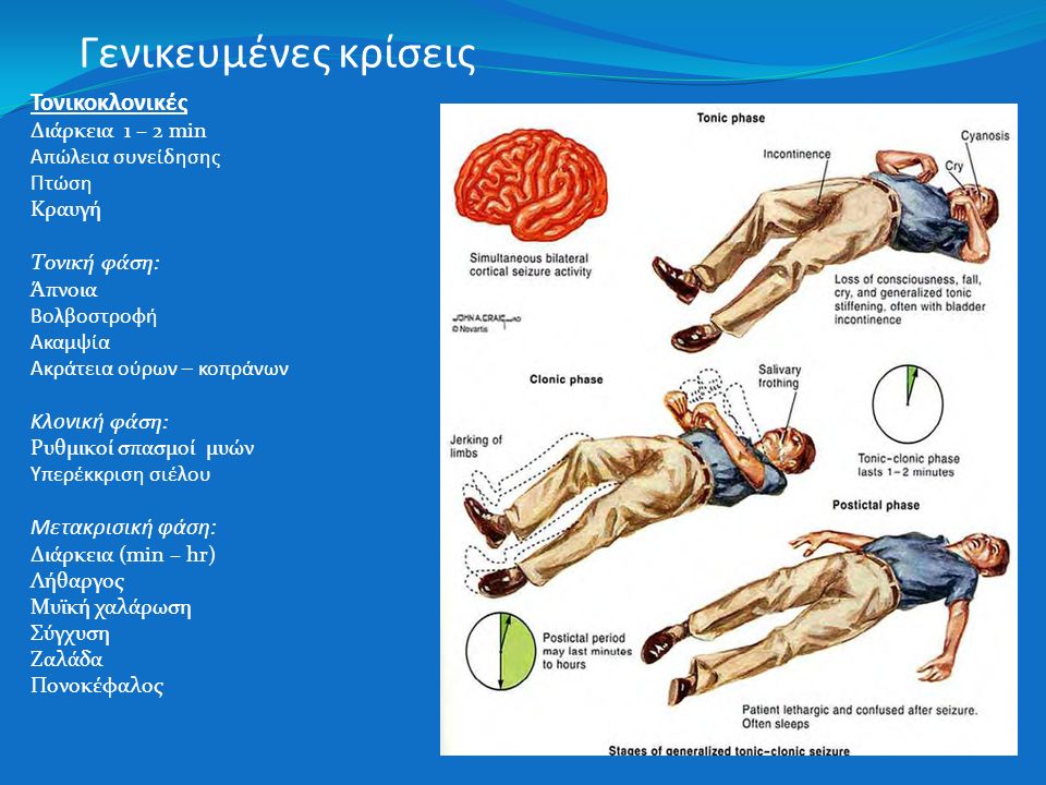 - Τονικοκλονική συνεχής σύσπαση ακολουθούμενη από ρυθμικές συσπάσεις και των τεσσάρων άκρων