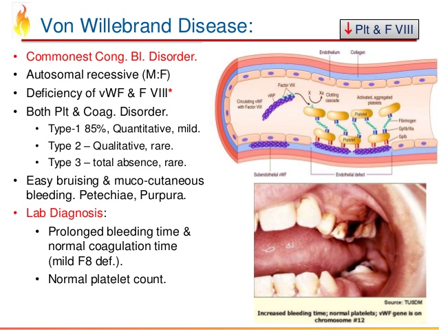 Σε περίπτωση σοβαρής ανεπάρκειας, μπορεί να υπάρχει αυτόματη αιμορραγία των ούλων, εκχύμωση και επίσταξη. Τα συμπτώματα της vWD περιλαμβάνουν μετεγχειρητική αιμορραγία, αιμορραγία μετά από οδοντική επέμβαση, αιμορραγία των ούλων, επίσταξη και εύκολοι μώλωπες. Η λήψη από του στόματος αντισυλληπτικών ως θεραπεία πρώτης γραμμής για την εμμηνόρροια μπορεί να οδηγήσει σε διόγκωση των ούλων και αιμορραγία στις γυναίκες. Οι διαταραχές των αιμοπεταλίων ή της πήξης με σοβαρά μεταβαλλόμενη αιμόσταση μπορεί να προκαλέσουν αυτόματη αιμορραγία των ούλων, όπως φαίνεται σε συνδυασμό με υπερπλαστικές υπεραιμικές αυξήσεις ούλων σε λευχαιμικούς ασθενείς. Η απόθεση αιμοσιδηρίνης και άλλων προϊόντων αποδόμησης του αίματος στις επιφάνειες των δοντιών τα χρωματίζει καφέ εάν συμβεί στοματική αιμορραγία για μεγάλα χρονικά διαστήματα. Η αιμορραγία προκαλείται επίσης από ιατρογενείς παράγοντες και από κακές πρακτικές στοματικής υγιεινής και από τραυματισμούς.
