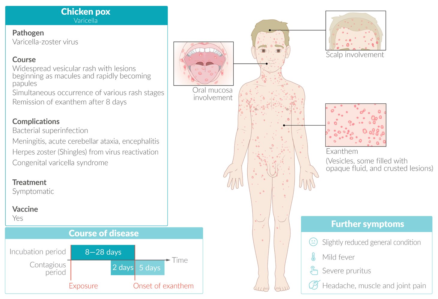 - Ο χρόνος επώασης της ανεμοβλογιάς είναι 14-16 ημέρες (κυμαίνεται από 11-21 ημέρες). Οι ασθενείς μεταδίδουν τη νόσο 24 ώρες πριν την εμφάνιση του εξανθήματος μέχρι τον σχηματισμό της τελευταίας κρούστας στις βλάβες. Οι περισσότεροι άνθρωποι νοσούν στην παιδική ηλικία και αποκτούν μόνιμη ανοσία