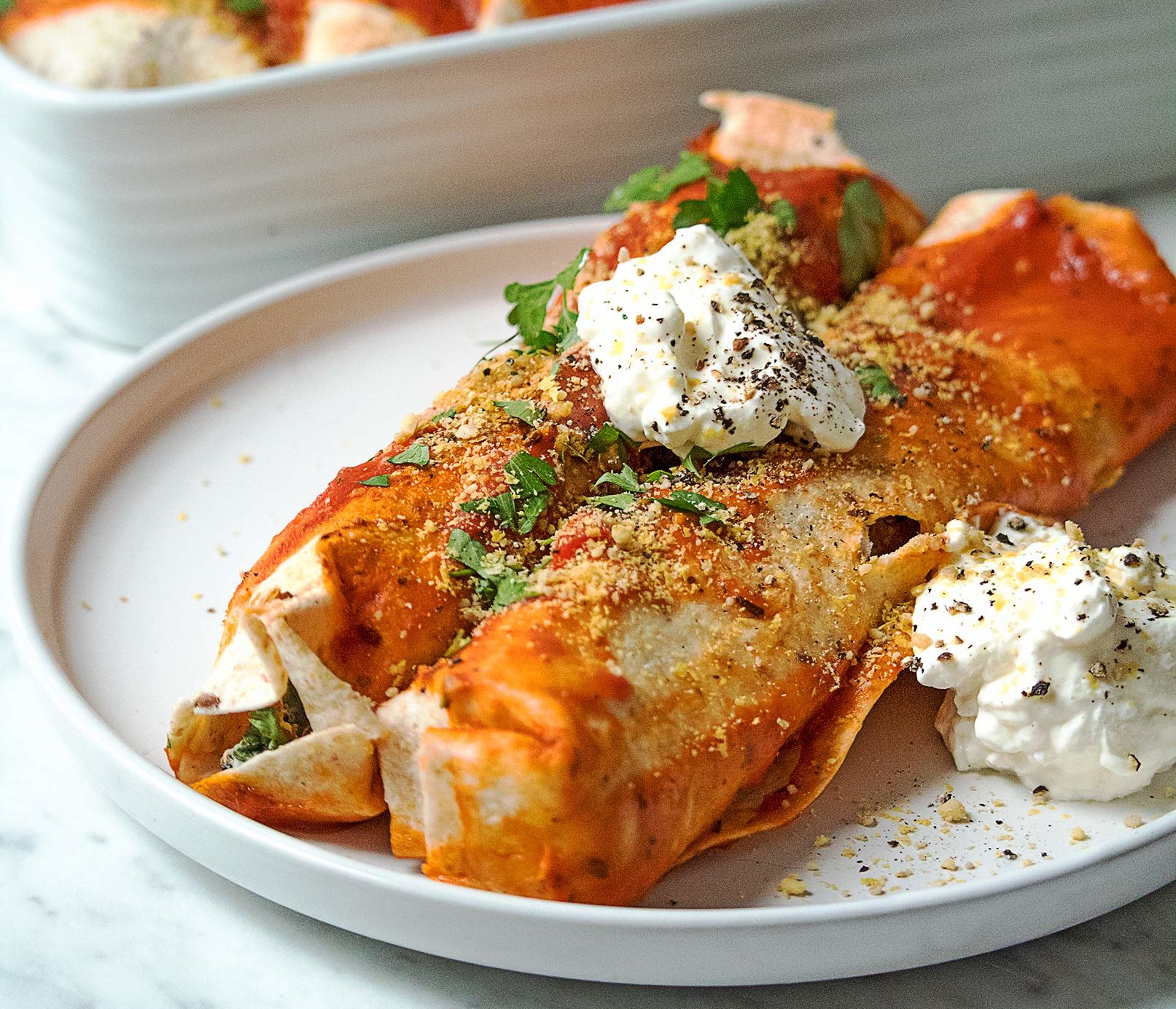 - Προαιρετικά: Προσθέστε 3/4 φλιτζάνι σάλτσα enchilada σε ένα χαμηλό πλατύ μπολ και στη συνέχεια βυθίστε γρήγορα κάθε ψητή τορτίγια στη σάλτσα μόνο για να το βάψετε.