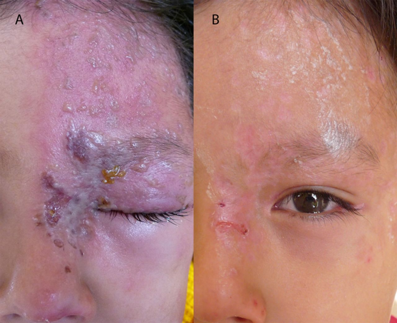 • Εξάνθημα, μετάβαση από βλατίδες σε κυστίδια και μετά σε φλύκταινες και τέλος σε εσχάρες