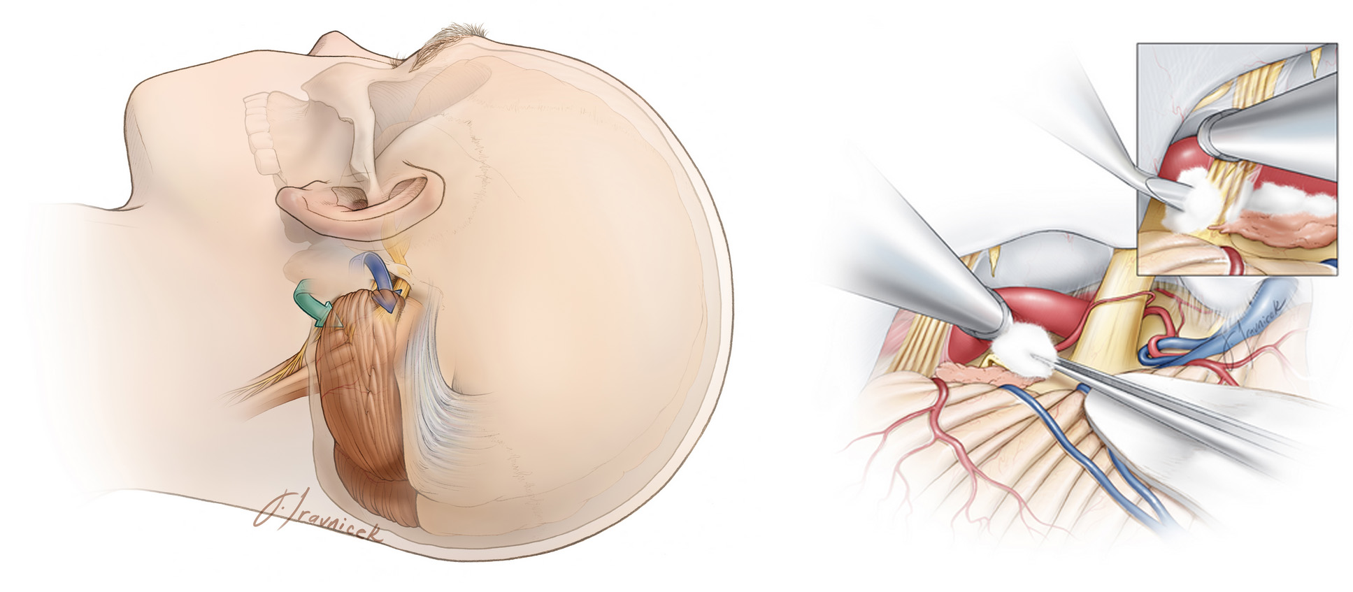 Η μικροαγγειακή αποσυμπίεση είναι μια χειρουργική επέμβαση για την ήπια επαναδρομολόγηση του αιμοφόρου αγγείου από τη συμπίεση του νεύρου, γεμίζοντας την αρτηρία με ένα σφουγγάρι. Η χειρουργική επέμβαση πραγματοποιείται με γενική αναισθησία και απαιτεί νοσηλεία 1 έως 2 ημερών. Κατά τη διάρκεια της χειρουργικής επέμβασης, δημιουργείται ένα άνοιγμα 2,5 εκατοστών, που ονομάζεται κρανιοτομή, στο κρανίο πίσω από το αυτί. Αυτό εκθέτει το νεύρο στη σύνδεσή του με το εγκεφαλικό στέλεχος. Συχνά εντοπίζεται το αιμοφόρο αγγείο (ενίοτε ο όγκος) που συμπιέζει το νεύρο. Αφού το νεύρο απελευθερωθεί από τη συμπίεση, προστατεύεται με ένα μικρό σφουγγάρι από τεφλόν. Το σφουγγάρι παραμένει μόνιμα στον εγκέφαλο. Η μικροαγγειακή αποσυμπίεση παρέχει ανακούφιση από τον πόνο στο 85% των ασθενών. Το κύριο πλεονέκτημα της μικροαγγειακής αποσυμπίεσηςείναι ότι προκαλεί ελάχιστες ή καθόλου παρενέργειες κατάποσης ή φωνής. Ωστόσο, υπάρχει 5% κίνδυνος θανάτου λόγω χειραγώγησης του κοντινού πνευμονογαστρικού νεύρου, το οποίο μπορεί να προκαλέσει προβλήματα με τον καρδιακό ρυθμό και την αρτηριακή πίεση.
